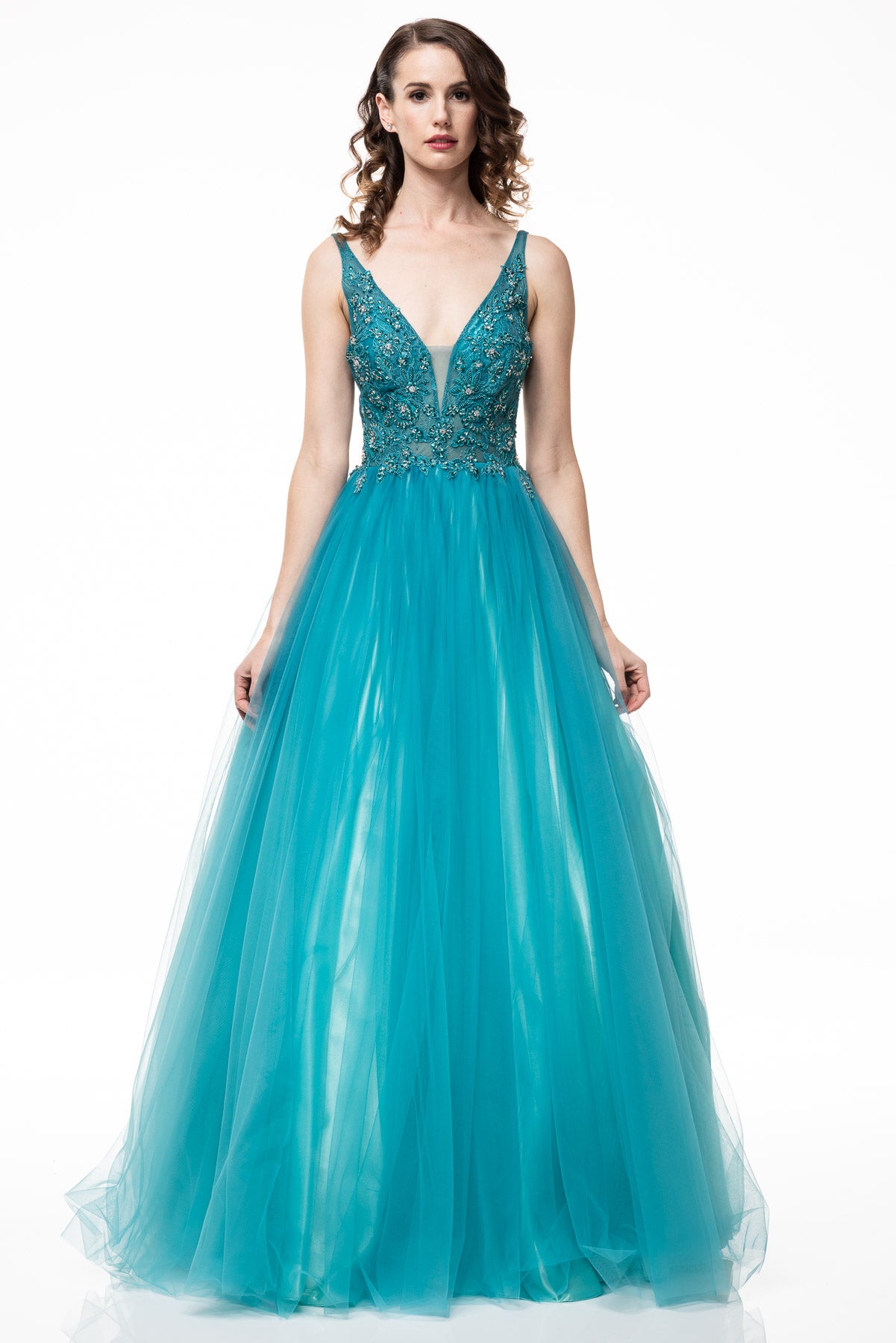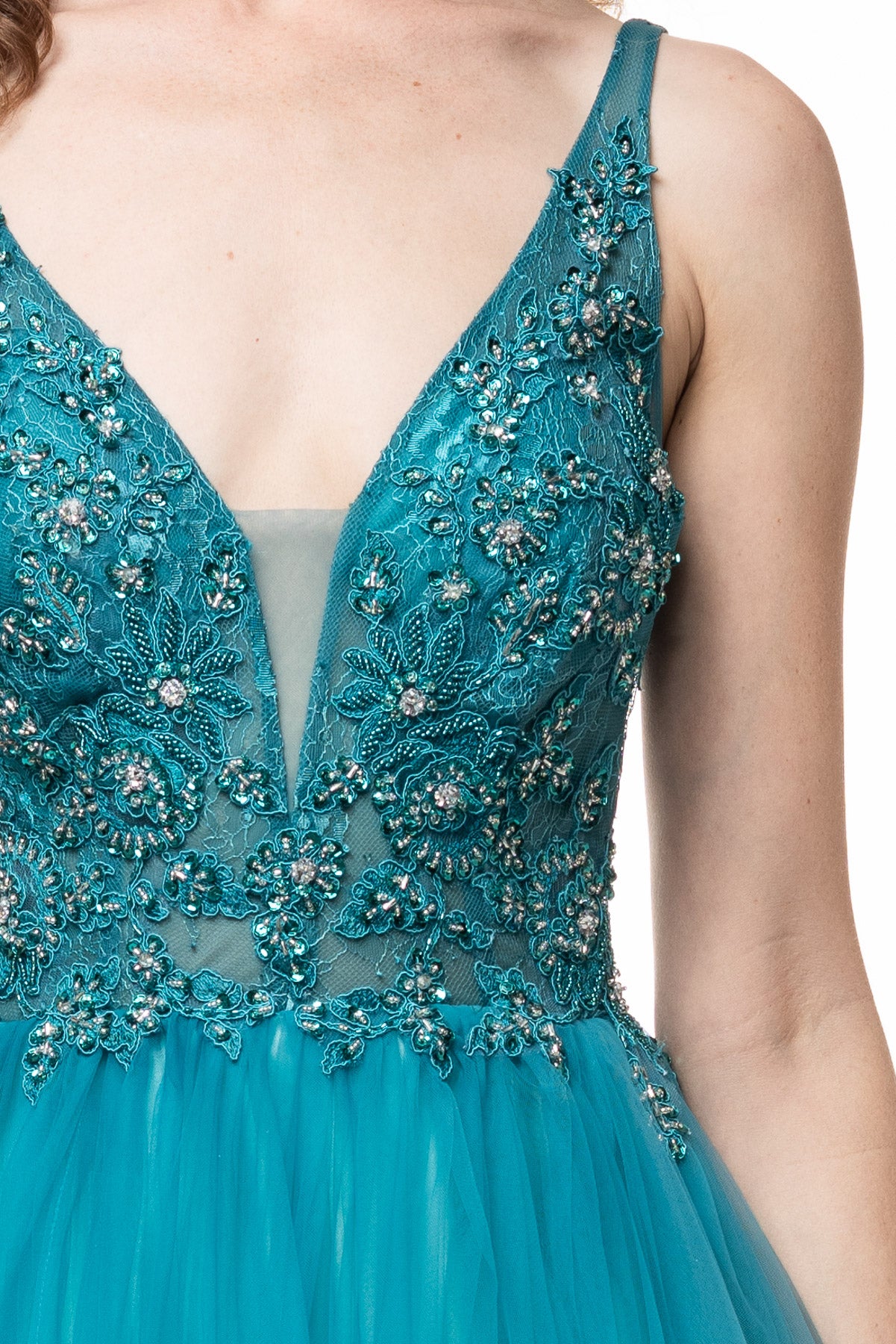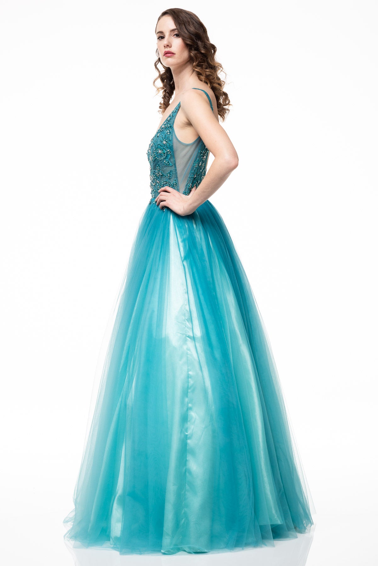 Este hermoso vestido azul turquesa es perfecto para quienes desean destacar con sofisticación y encanto. Su escote profundo en "V" y delicados tirantes realzan la feminidad, mientras que el corsé decorado con bordados y pedrería añade un toque de lujo. La falda de tul en corte princesa fluye con gracia, aportando volumen y movimiento.