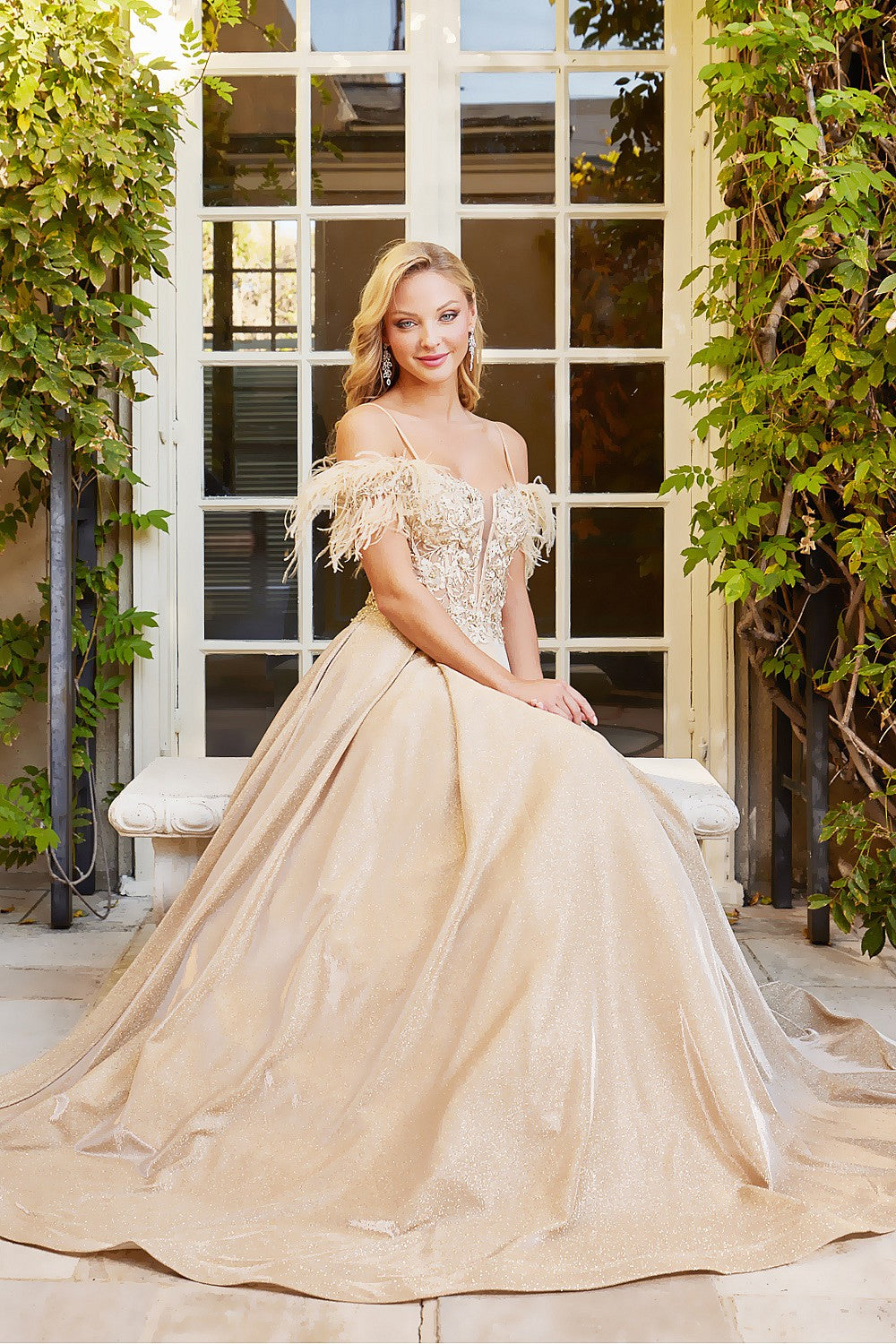 Este deslumbrante vestido en color champagne combina sofisticación y glamour para hacerte destacar en cualquier evento especial. Con un escote corazón profundo y delicados tirantes con detalles de plumas en los hombros, este diseño emana un aire romántico y moderno.