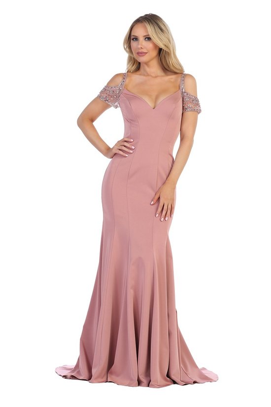 Elegante y sofisticado, este vestido en tono rosa empolvado combina un diseño clásico con detalles modernos y un ajuste impecable. Su corte sirena realza la figura con delicadeza, mientras que las mangas decoradas con pedrería añaden un toque de lujo y glamour.