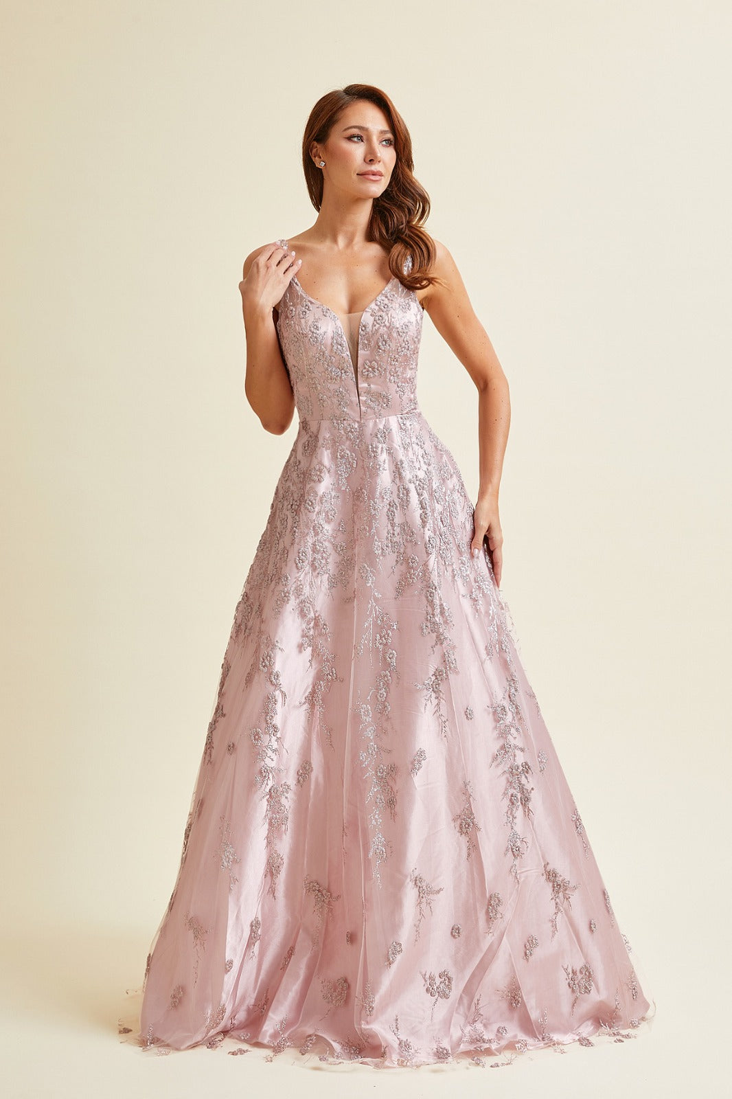 Un diseño de ensueño que combina la delicadeza del rosa empolvado con la elegancia del encaje bordado y un sutil brillo que lo hace perfecto para ocasiones especiales. Su corte clásico y detalles refinados crean un look etéreo y sofisticado.