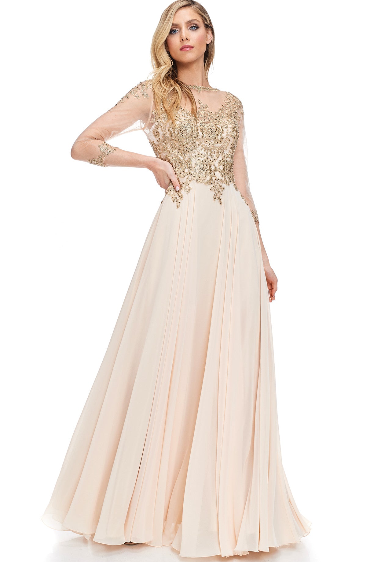 - Diseño: Parte superior con aplicaciones bordadas en tonos dorados y detalles en pedrería que aportan un brillo sutil. El escote ilusión y las mangas largas de tul le dan un toque clásico y refinado.