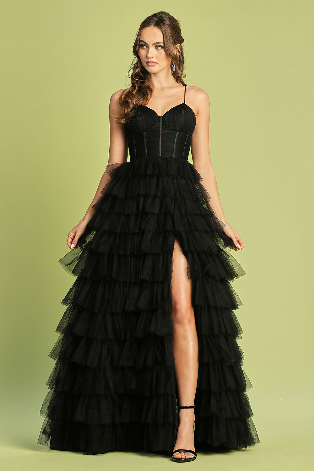 La falda en capas de tul escalonadas crea un volumen dramático y un movimiento fluido, ideal para impactar en cualquier evento. Además, la abertura lateral agrega un toque sensual y contemporáneo, haciéndolo perfecto para una entrada inolvidable.