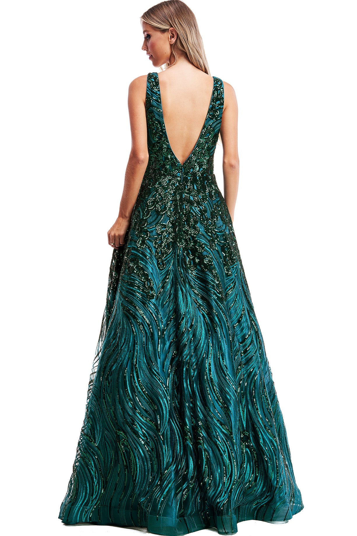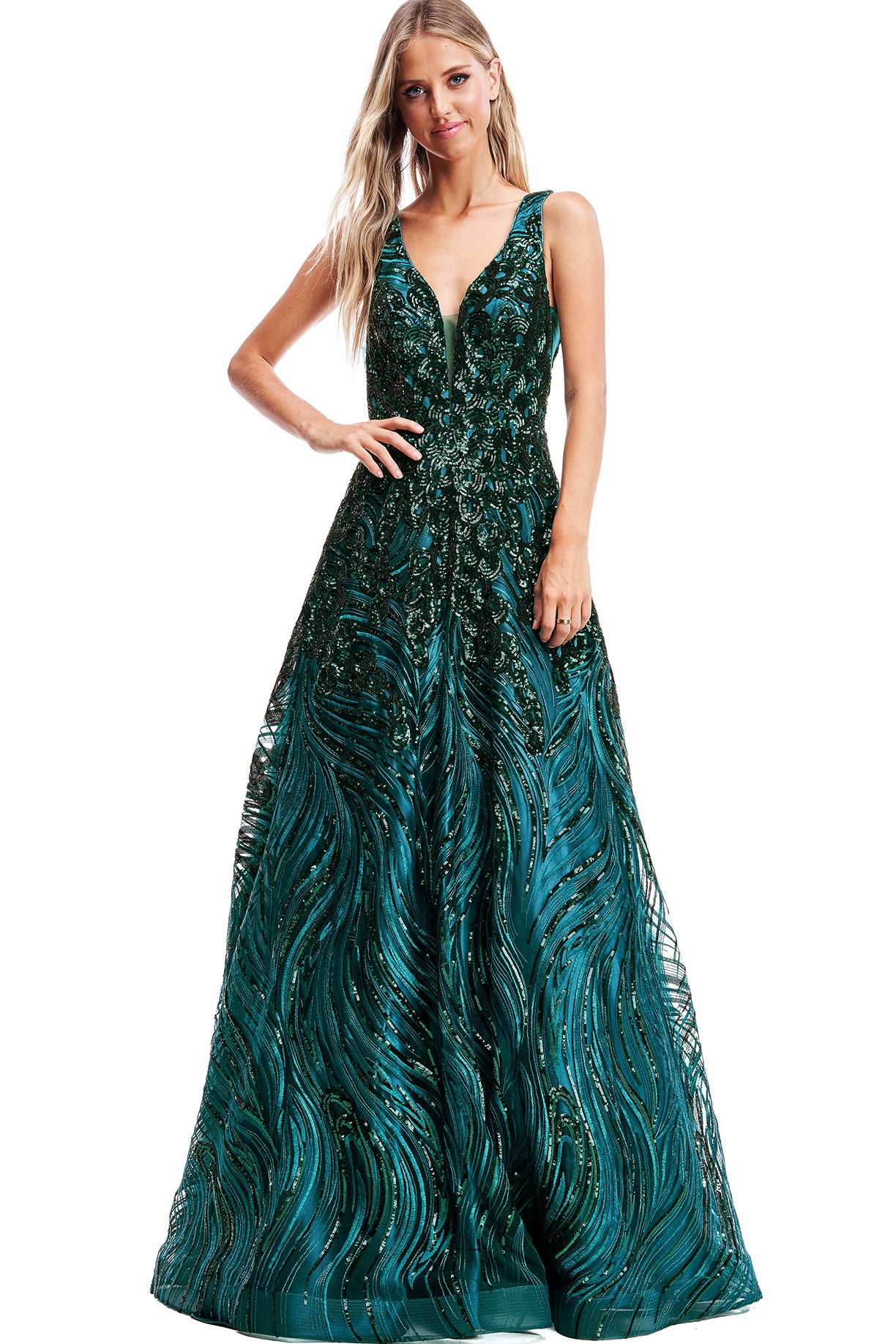Este espectacular vestido verde esmeralda está diseñado para quienes buscan impactar con elegancia y estilo. Su cuerpo bordado con patrones ondulados y aplicaciones brillantes evoca un diseño único inspirado en la naturaleza. El escote profundo en forma de V aporta un toque sensual y moderno, mientras que la falda amplia con caída fluida garantiza un movimiento etéreo digno de un cuento de hadas.