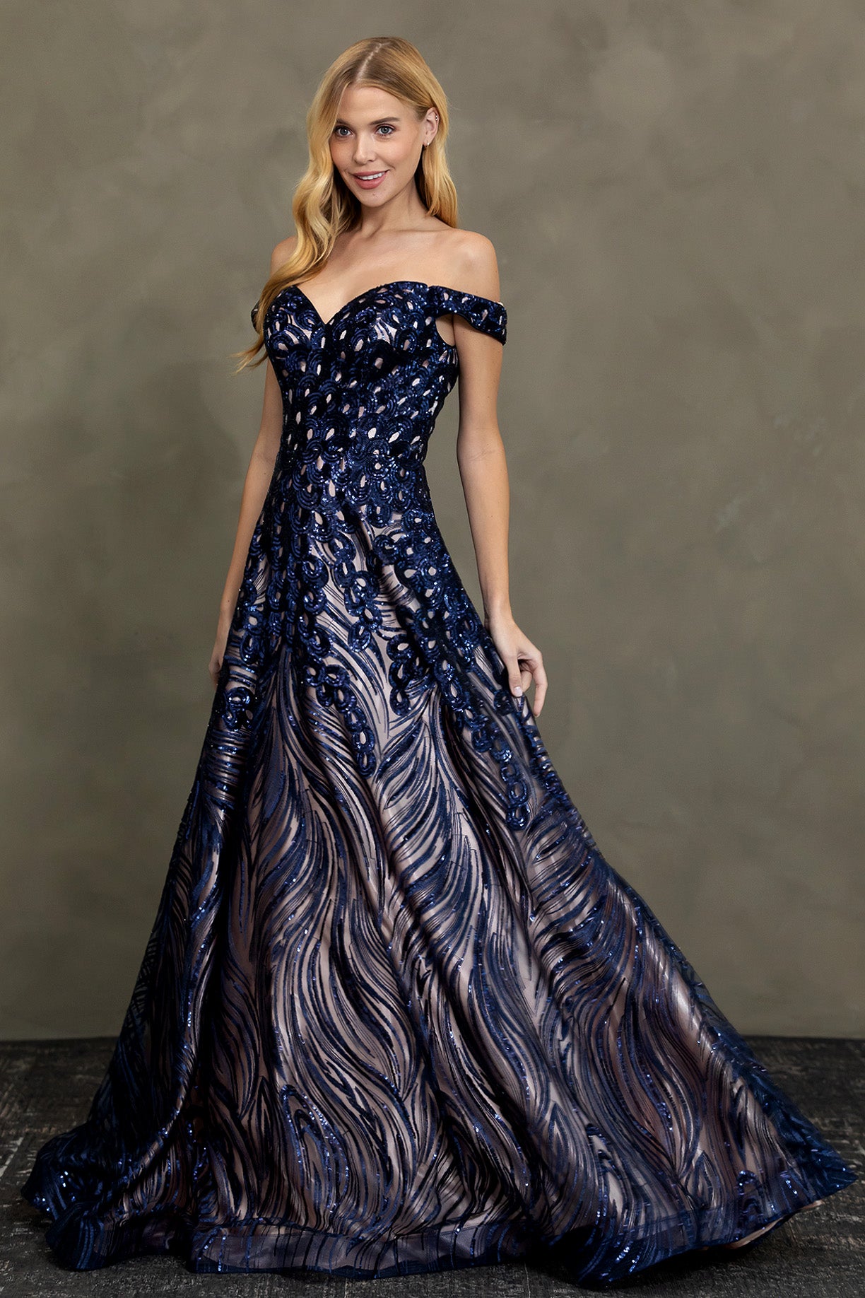 Este deslumbrante vestido azul marino combina elegancia y glamour en un diseño espectacular que captará todas las miradas.